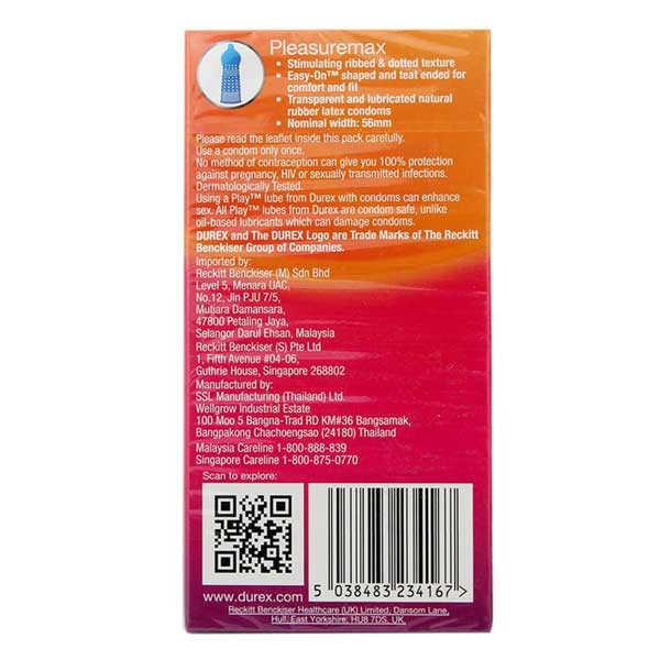 Bao cao su Durex là dòng sản phẩm uy tín được sản xuất bằng cao su thiên nhiên cao cấp, đáp ứng các tiêu chuẩn sản xuất nghiêm ngặt nhằm đảm bảo độ an toàn tối đa cho người dùng. Sản phẩm có nhiệm vụ hỗ trợ tránh thai và giảm nguy cơ lây nhiễm các bệnh qua đường tình dục. Phiên bản Durex Pleasuremax được thiết kế với gân và chấm nổi, mang đến cảm giác kích thích rõ rệt hơn, giúp cuộc yêu thêm thăng hoa. Bên cạnh đó, kiểu dáng easy-on và lớp gel bôi trơn silicone giúp bao ôm sát và dễ dàng sử dụng.