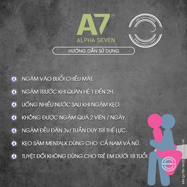 A7 dành cho người hay mệt mỏi, stress, thiếu ngủ, vận động nhiều hoặc gặp các vấn đề như xuất tinh sớm, suy nhược cơ thể, giảm ham muốn. Cách sử dụng rất đơn giản, ngậm trực tiếp trong miệng để hoạt chất hấp thu nhanh. Không dùng quá hai viên trong 24 giờ và nên uống thêm nước sau khi dùng. Những người có bệnh tim mạch hoặc bệnh mãn tính cần tránh sử dụng để đảm bảo an toàn.