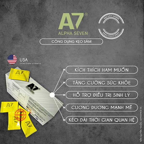 Nhờ sự kết hợp độc đáo này, A7 mang lại hiệu quả sinh lý rõ rệt. Chỉ một viên kẹo ngậm có thể giúp kéo dài thời gian quan hệ ít nhất 45 phút và duy trì tác dụng trong nhiều giờ tiếp theo, lên đến 96 giờ. Sản phẩm còn hỗ trợ giải rượu cực tốt, rất phù hợp cho những người thường xuyên giao tiếp, uống bia rượu hay làm việc căng thẳng.